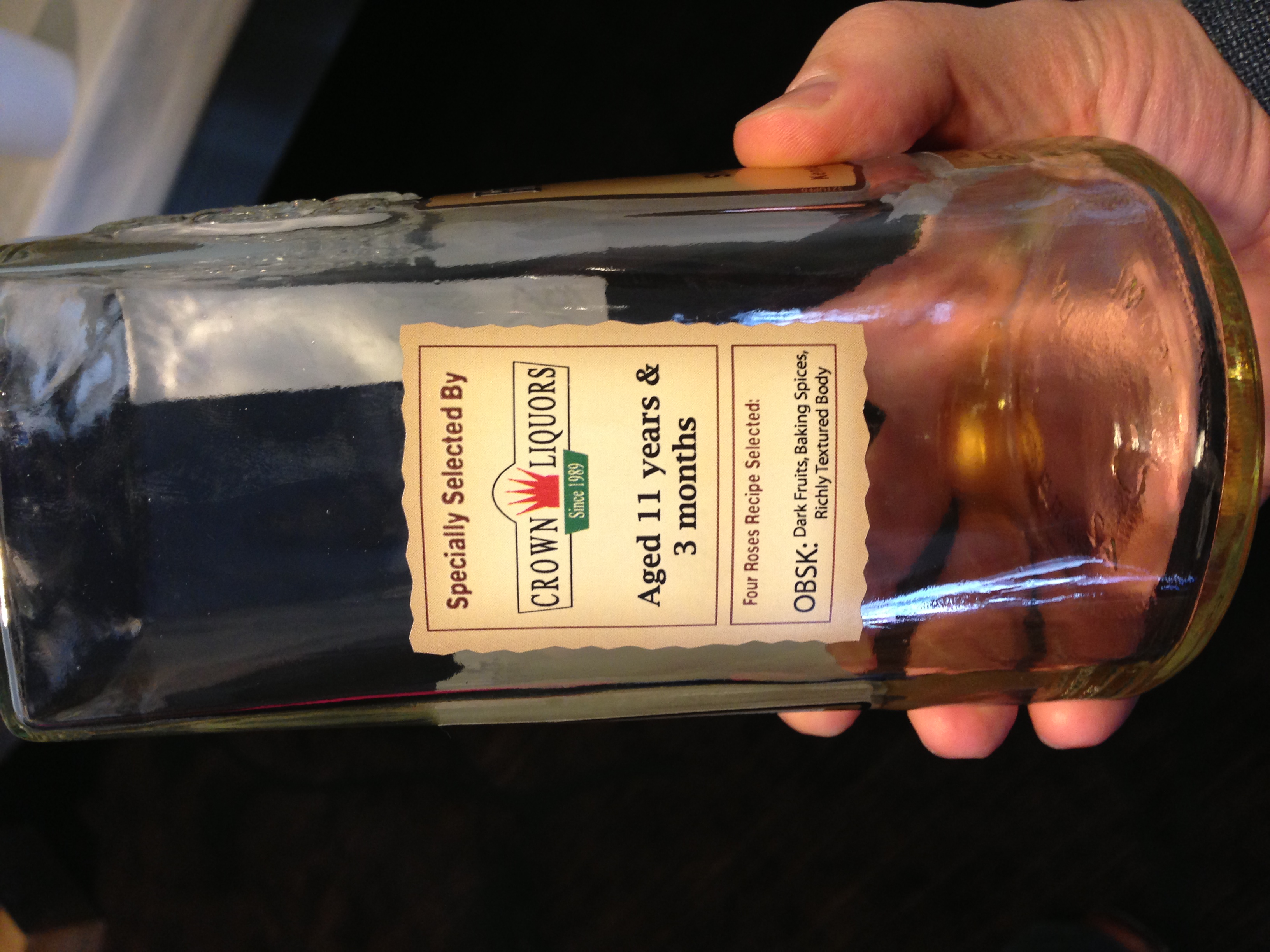 The best bourbon, the lovely Single Barrel over 11-years-old full of spices, was Four Roses Single Barrel, the OBSK recipe, “specially selected by Crown Liquors” in Indianapolis, Indiana.