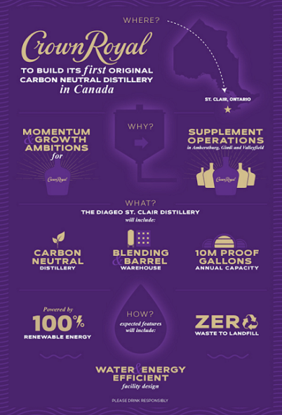Global beverage alcohol leader Diageo announced plans today for a new CAD$245 million distillery to support momentum and growth ambitions for its Crown Royal Canadian Whisky brand. The facility, with capacity to produce up to 20 million LAA’s (litres of absolute alcohol, the equivalent to 10.5 million proof gallons) annually, will sit on approximately 400 acres in Ontario’s St. Clair Township, and includes a distillery, as well as blending and warehousing operations.